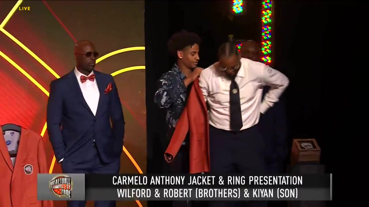 9月6日,2025届名人堂仪式彩排现场,安东尼之子基扬亲自为父亲披上象征荣誉的名人堂夹克。