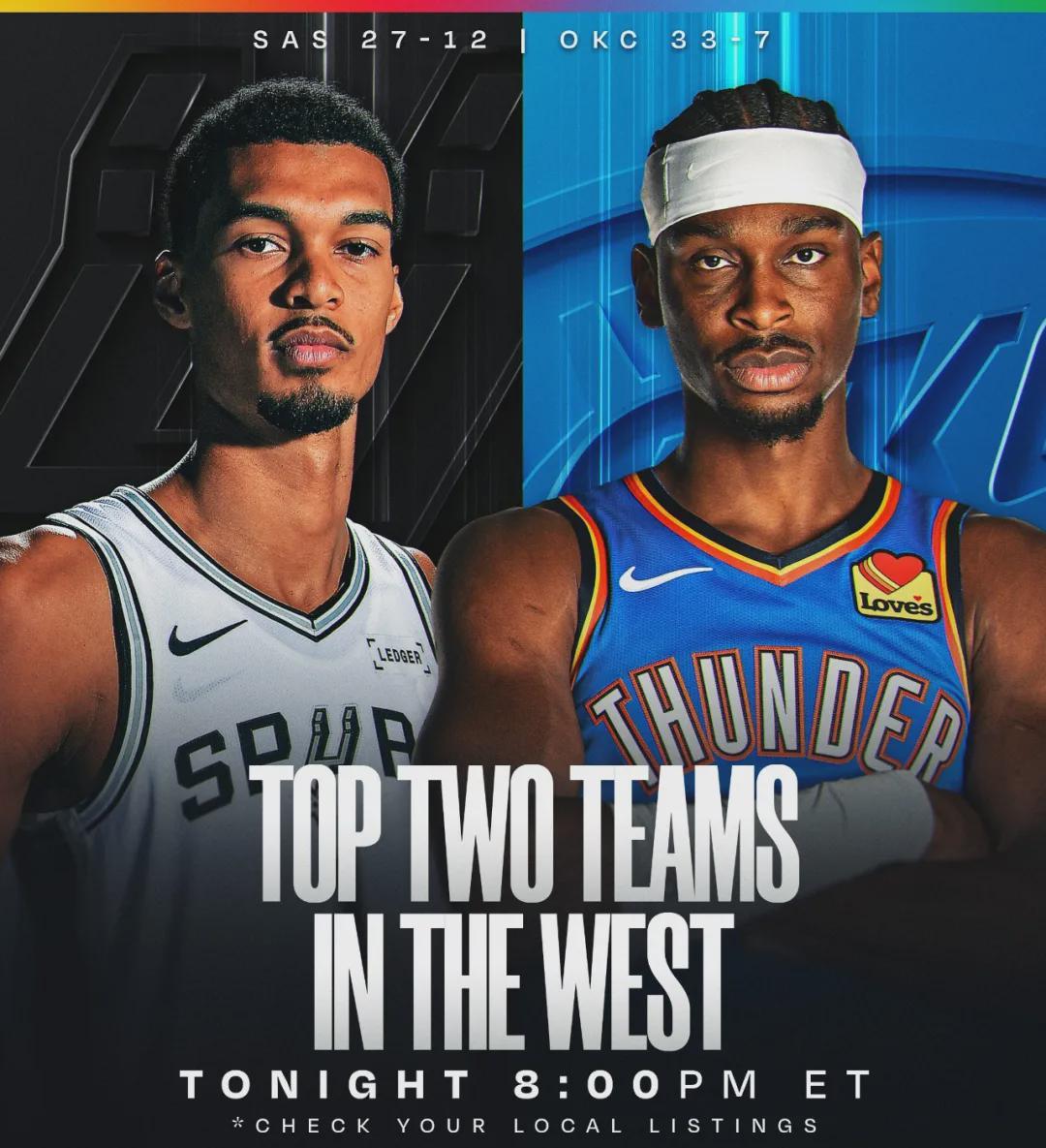 北京时间1月14日,NBA常规赛:雷霆主场vs马刺。这是两队本赛季第四次交手,前三次均是马刺获胜。截至今天赛前,雷霆33胜7负依然排名联盟第一,马刺27胜12负排名西部第二,落后雷霆5.5个胜场。过去10场,马刺仅5胜5负。