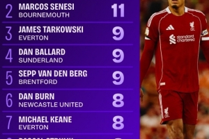 英超首轮解围数TOP10:范迪克17次居首,伯恩茅斯后卫塞内西次之